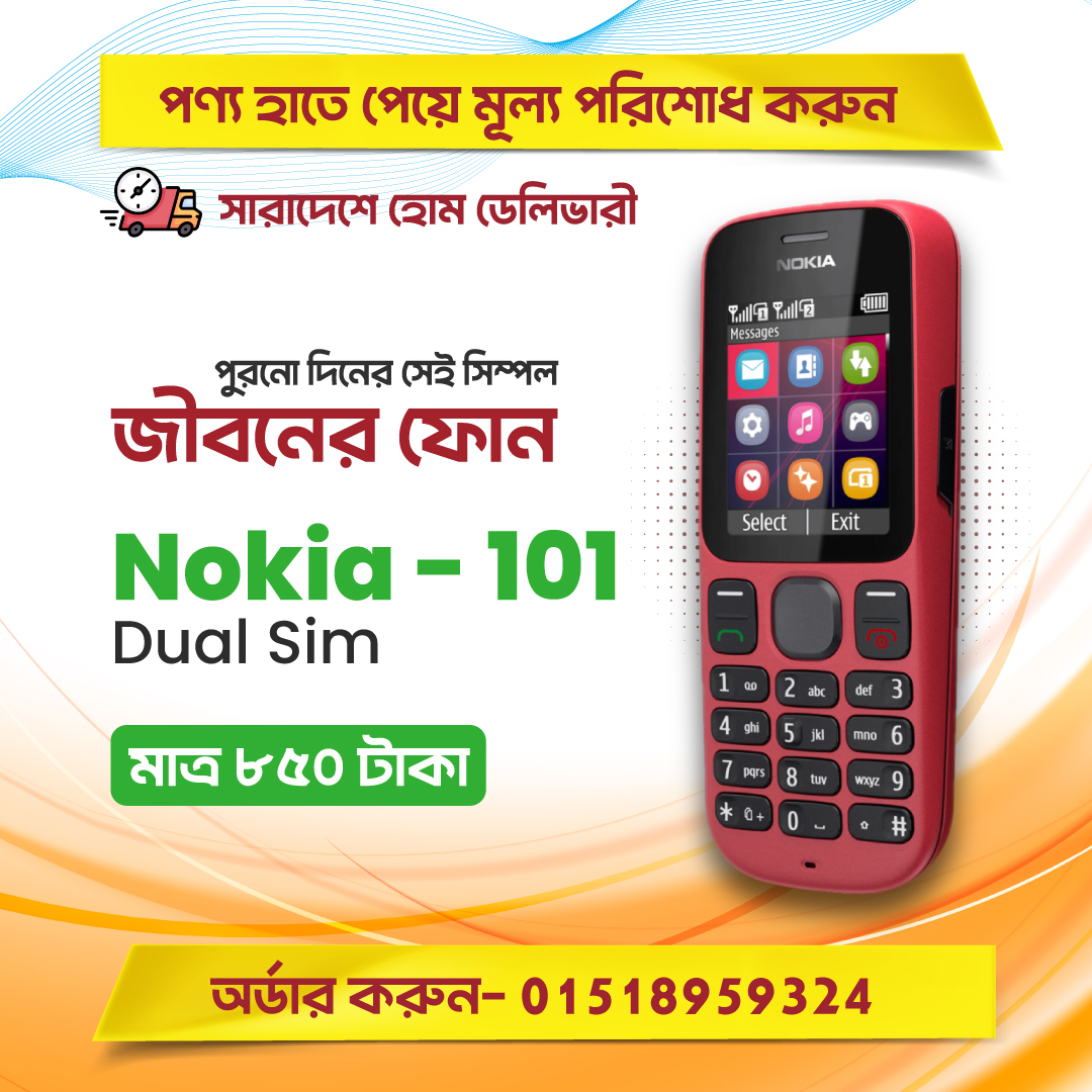 নোকিয়া ১০১ দুই সিম ও মেমোরী কার্ড ব্যবহার করা যায়। এই মোবাইল এর বিশেষত্ব হচ্ছে এটিতে ক্যমেরা নেই এবং এটি অত্যন্ত চিকন বা চ্যাপ্টা একটি বার ফোন।